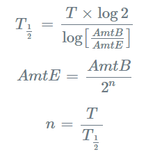 - usa la formula di emivita per calcolare la quantità rimanente di sostanza dopo il tempo trascorso.