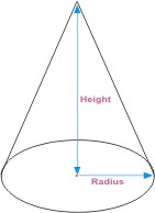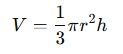 con : Jumlah kon dikira sebagai satu pertiga daripada jumlah silinder dengan asas dan ketinggian yang sama: