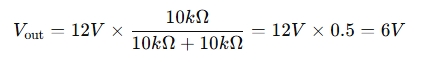 Nếu bạn có đầu vào 12V, với các điện trở r1 = 10kΩ và r2 = 10kΩ , điện áp đầu ra sẽ là: